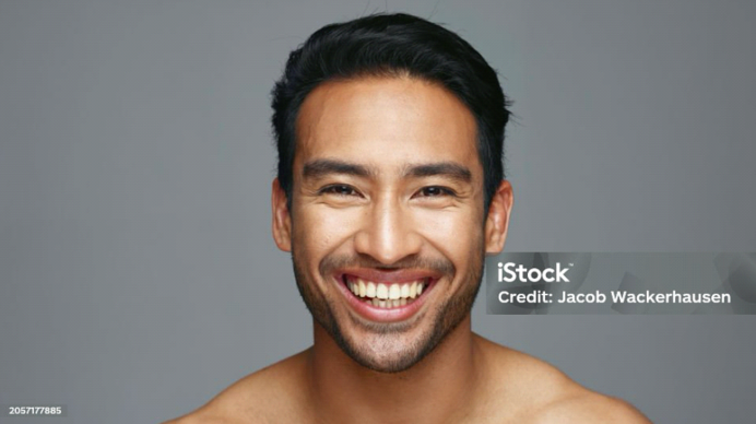 A shirtless man smiling confidently showing even toned smooth skin as a result of facial and body scar camouflage or paramedical tattooing treatment