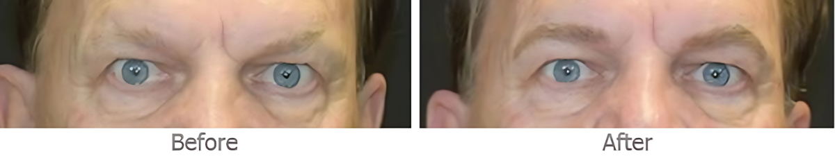 Side by side comparison image of a male clients eyebrows before and after a cosmetic tattoo procedure demonstrating improved shape density and definition