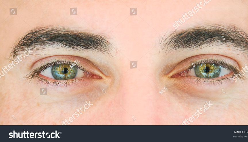 A detailed close up image showing a mans striking green eyes and naturally dense eyebrows highlighting strong facial features and defined brow shape