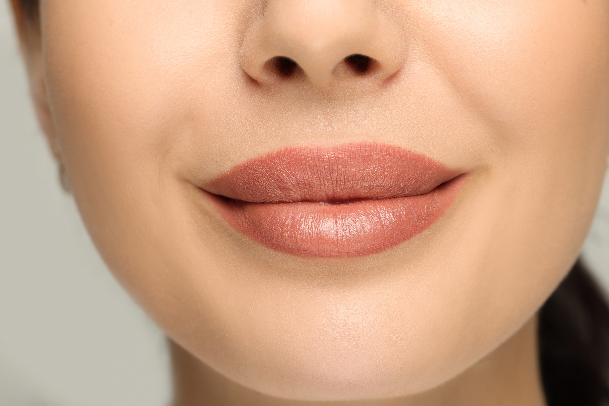 A close up image of a womans lips featuring a soft nude matte shade providing a natural yet defined look with a smooth finish